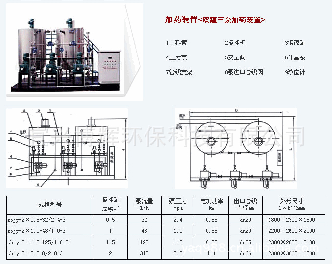 1. 攪拌機:有攪槽機和攪拌裝置組成。其作用是使需投加的溶質和水(溶劑)按一定比例配置后,使其充分混合。