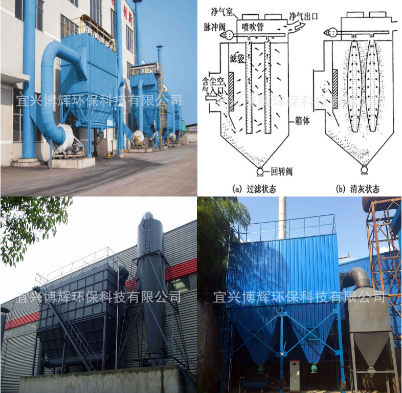 含塵氣體從除塵器進出風箱體中的進風口(32系列從灰斗進入)進入經斜隔板轉向于灰斗,同時氣流速度變慢,由于慣性作用,氣體中粗顆粒粉塵落入灰斗,細小塵粒隨氣流折而向上進入過濾室,粉塵附著于濾袋的外表,凈化后的氣體透過濾袋進入上部清潔室,由各分室清潔室匯集經出風口,由除塵系統的主風機吸出排入大氣。隨著過濾工況的不斷進行,隨著于濾袋外表的粉塵逐漸增多,氣流通過的阻力也逐漸增大。當達到一定阻力值時(例如1770pa),根據需要可以手動,也可以經過定壓或定時清灰程序電控儀,自動控制啟動除塵器第一個分室的提升閥關閉,切斷通過過濾室的氣流,再開啟脈沖閥釋放高壓壓縮空氣,對第一個分室氣箱內所有濾袋進行脈沖噴吹清灰(停風清灰),使每一個濾袋突然膨脹,從而振落袋表面積附的粉塵,使濾袋內外差恢復到開始使用狀態,粉塵沉落灰斗。隨后程控儀按規定間隔時間打開提升閥,恢復第一室的過濾,再啟動第二分室的提升閥,關閉切斷第二室的過濾氣流,開啟第二分室的電磁閥釋放高壓壓縮空氣,對第二分室氣箱內所有濾袋進行停風脈沖噴吹清灰,清除第二分室濾袋上的粉塵。之后程控儀打開第二分室提升閥,恢復第二分室的過濾。此后按預告規定的電控程序對第三分室、第四分室……的濾袋進行停風噴吹清灰,直至最后一個分室清灰完畢,關閉電控儀,除塵器全部恢復正式過濾收塵。