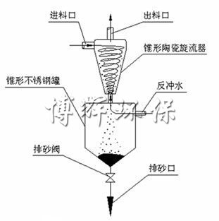 旋流除砂器是利用離心分離的原理進行除沙,由于進水管安裝在筒體的偏心位置,當水通過旋流除砂器進水管后,首先沿筒體的周圍切線方向形成斜向下的周圍流體,水流旋轉著向下推移,當水流達到錐體某部位后,轉而沿筒體軸心向上旋轉,經出水管排出,雜污在流體慣性離心力和自身重力作用下,沿錐體壁面落入設備下部錐形渣斗中,錐體下部設有構件防止雜物向上泛起,當積累在渣斗中的雜物到一定程度時,只要開啟手動蝶閥,雜物即可在水流作用下流出旋流除沙器。
