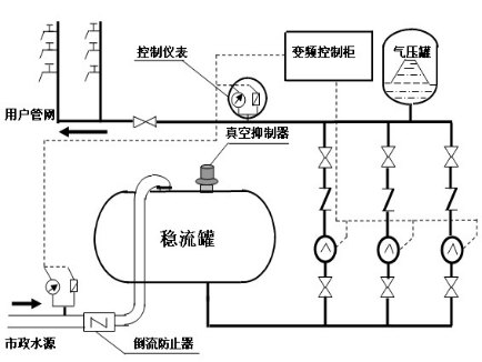第二階段是采用“儲水池+水泵+壓力罐”的方法,市政來水進入儲水池,然后由水泵加壓后送至壓力罐,由壓力罐向用戶供水,蓄水池起到高峰用水時調節作用;