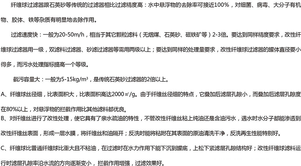 改性纖維球過濾器的性能指標與其它過濾器相比改性纖維球過濾器有以下優點